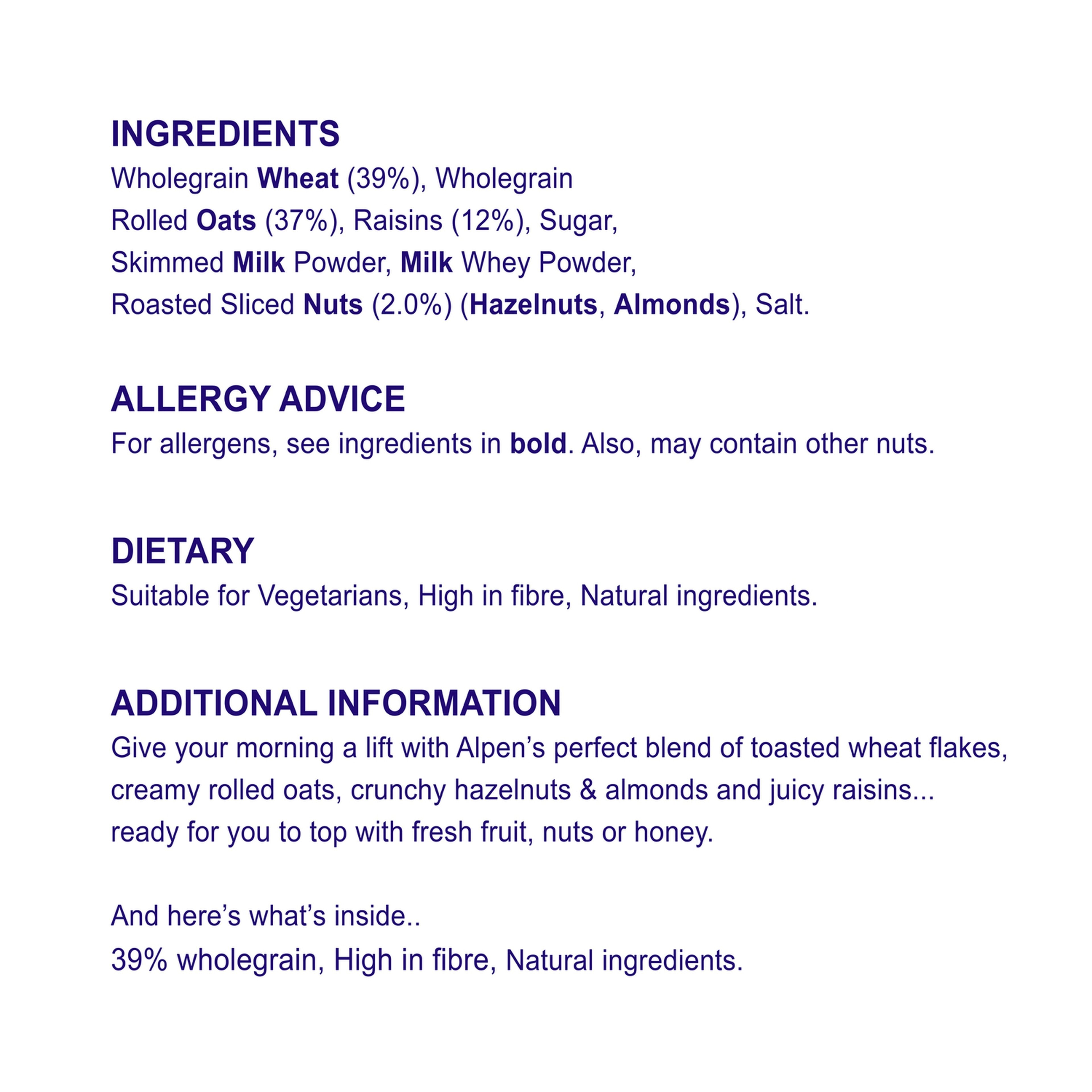 Alpen Original Muesli is a classic blend of wholegrain oats, crispy wheat flakes, juicy raisins, and roasted hazelnuts and almonds, lightly sweetened for a deliciously balanced taste. Packed with natural ingredients and a satisfying crunch, it’s the perfect way to start your day with energy and flavor. Enjoy it with milk, yogurt, or as a versatile topping for your favorite breakfast creations.